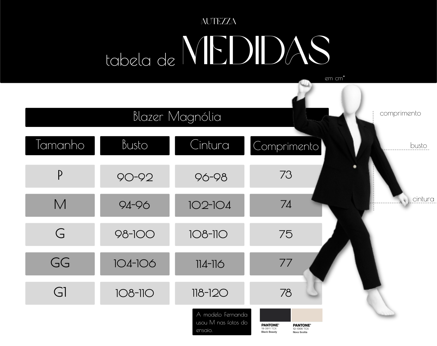 Confeccionado em tecido com 95% poliéster e 5% elastano, possui forro interno 100% poliéster, garantindo conforto e caimento estruturado.