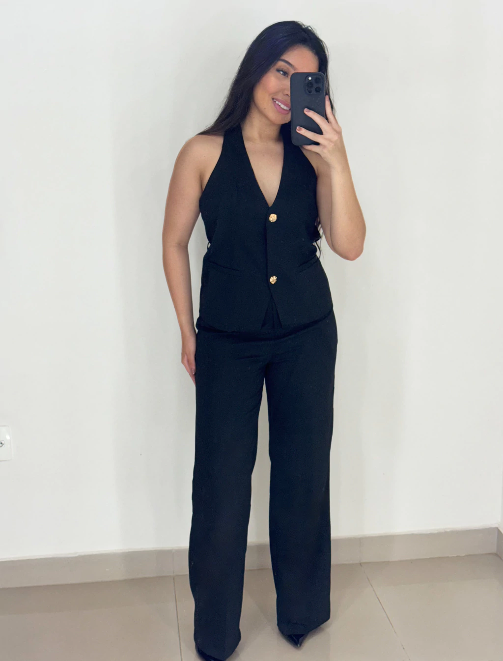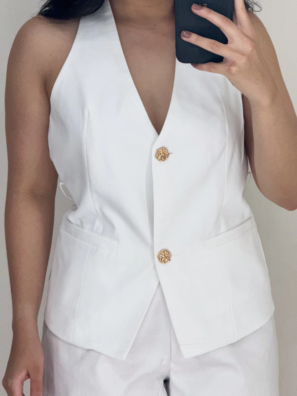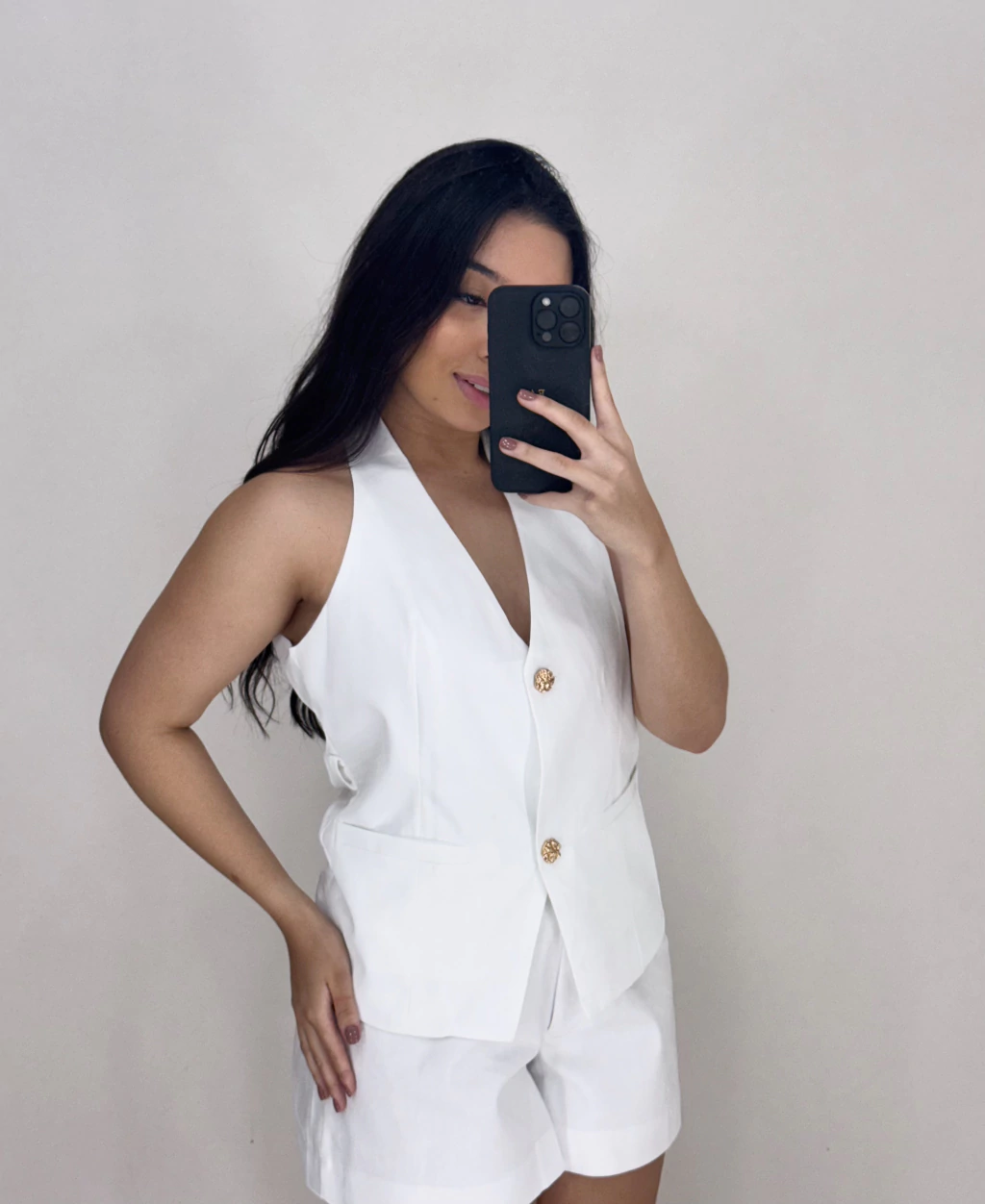 Além de apresentar detalhes frontais que remetem a bolsos decorativos, adicionando um toque de elegância ao design, conta ainda com forro 100% poliéster, que garante conforto e excelente acabamento, fechamento por botões metálicos orgânicos dourados, decote em V e modelagem nadador nas costas, que equilibra sofisticação e modernidade.
