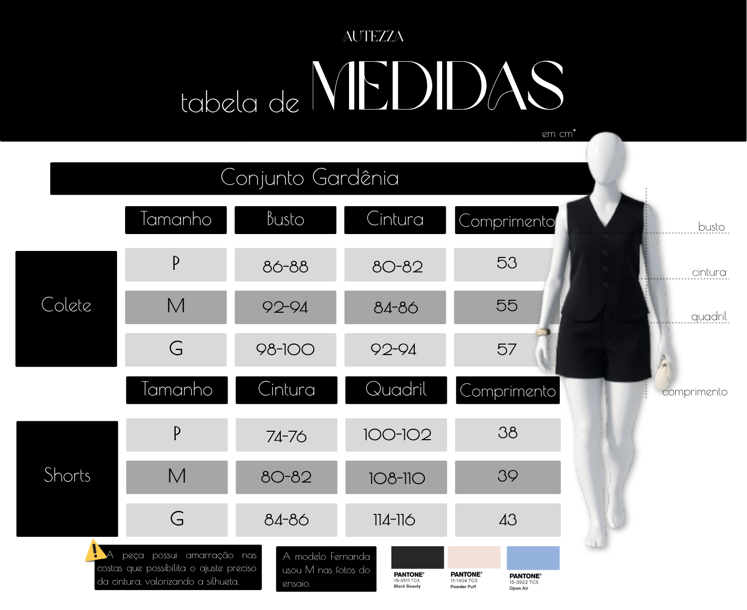 O Conjunto Gardênia combina colete e shorts em alfaiataria premium, confeccionados em tecido com 93% viscose e 7% poliéster, que oferece toque suave e caimento impecável.